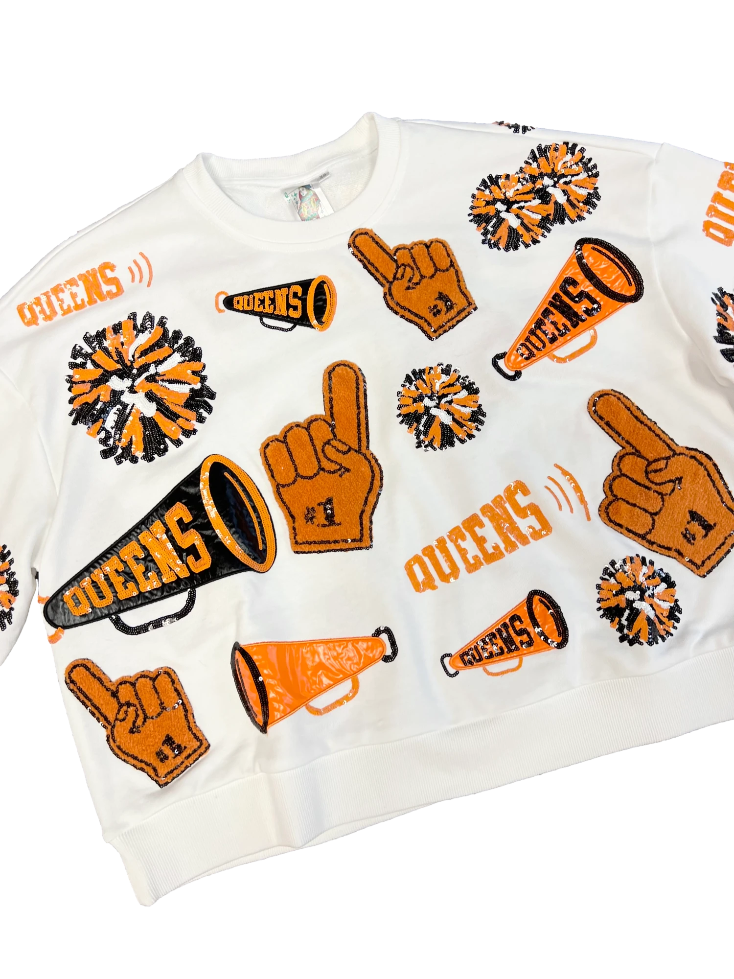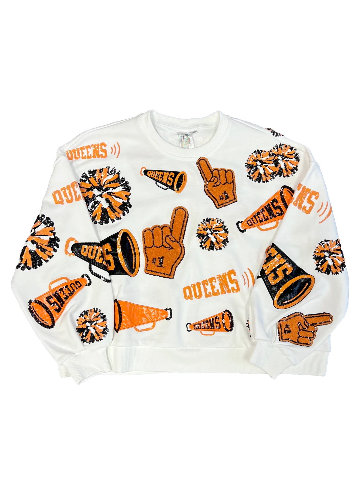 This Orange & Black Cheers Queen Icon Sweatshirt is a must-have in any gameday enthusiast’s wardrobe. It features an oversized fit for extra comfort and comes with a variety of iconic cheers motifs such as megaphone, foam finger, and pom pom. Enjoy the perfect combination of style and comfort!