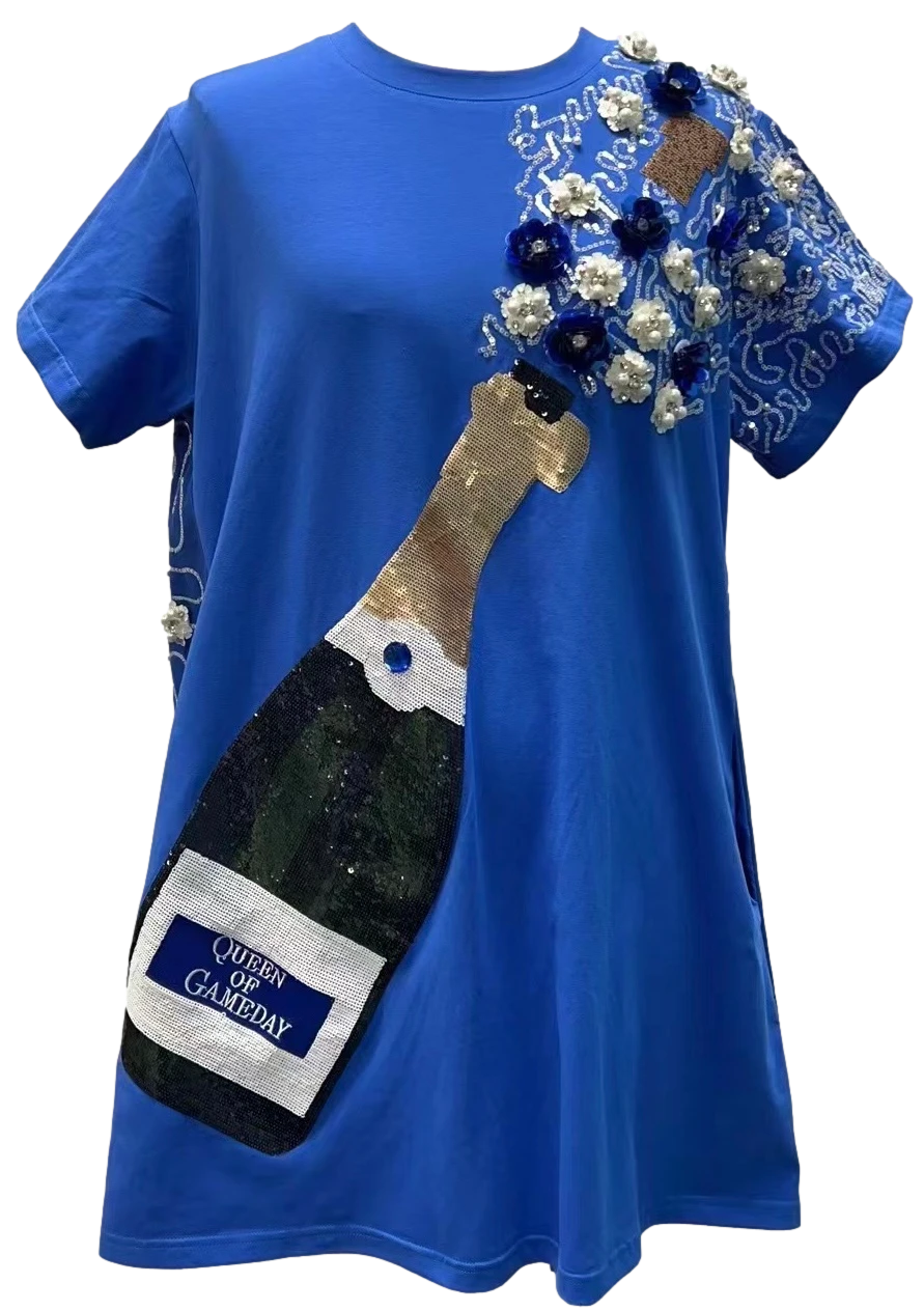 Be the first to review “Queen Of Sparkles Royal & White Popping Champagne Tee Dress” Cancel reply