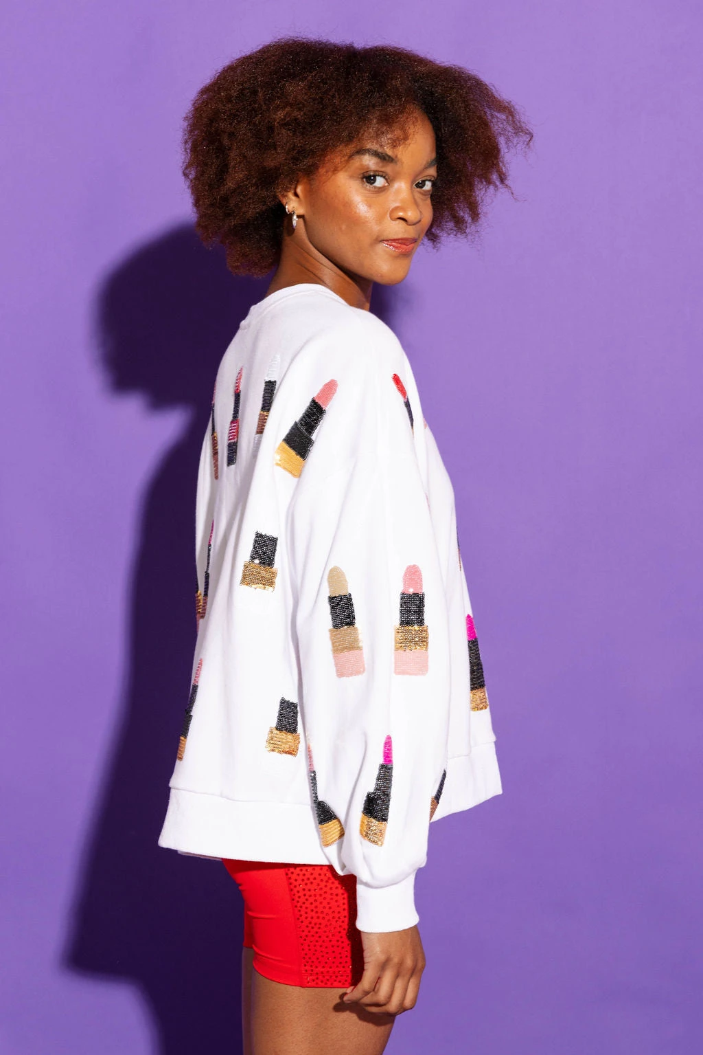 This White, Black & Gold Lipstick Sweatshirt is a fashionable statement piece. Crafted from soft and comfortable fabric, this oversized sweatshirt is adorned with sequin lipstick icons to make an eye-catching statement. Perfect for those who want to stand out with their look.